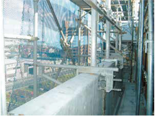 ●従来の枠組足場を使用せずにベランダ部よりハネ出して使用し、盛替えが可能です。