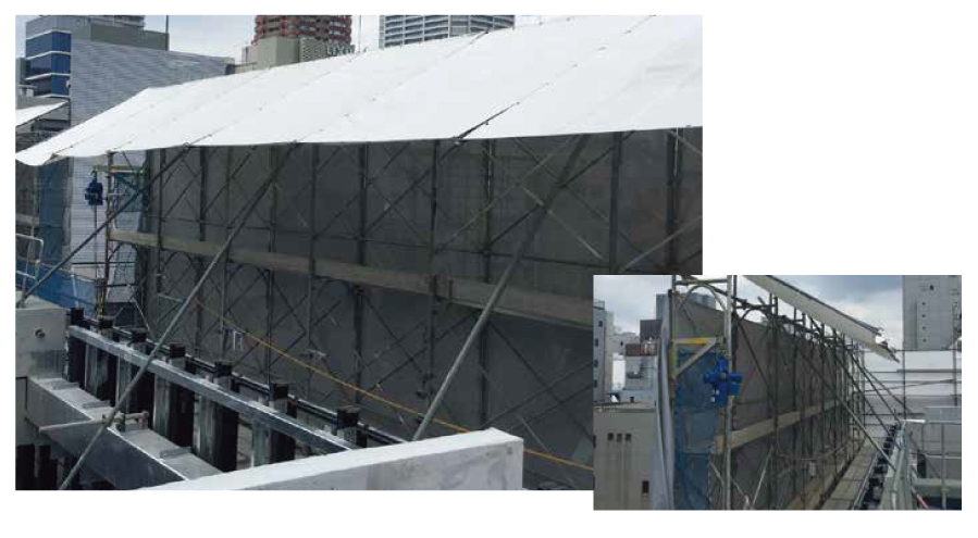 ●従来の枠組み足場の最上部に簡単に簡易屋根が出来る。