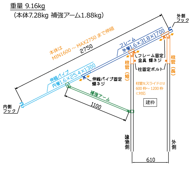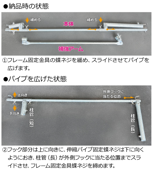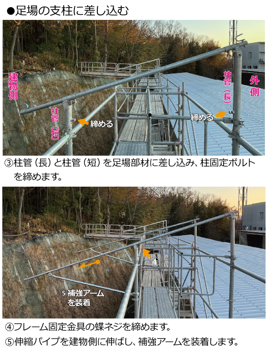 ・伸縮パイプを伸ばしたとき、軒下がRF面より1500mm位になるように足場をセットして下さい。