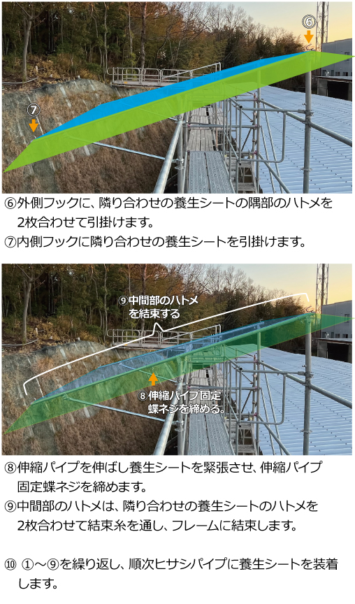 ※積雪10cm以上、風速15m/sec以上の風の場合は、養生シートをたたむか、外してください。