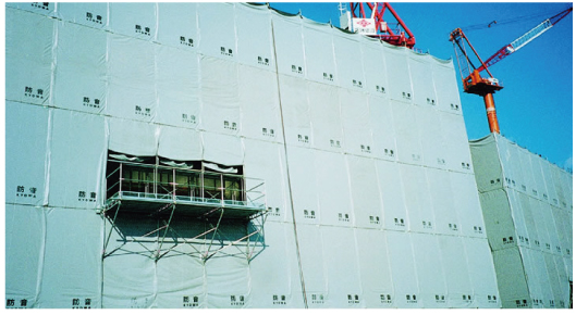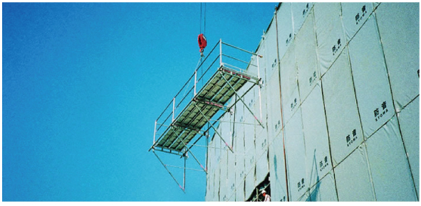 ●地上面でユニットを組み立てた後、クレーンで足場に取り付ける架設システムを採用。安全かつスピーディな架設と解体作業を実現しました。足場の2段目から取付可能。もちろん足場上でも手作業による架設・解体作業が安全・簡単に行えます。