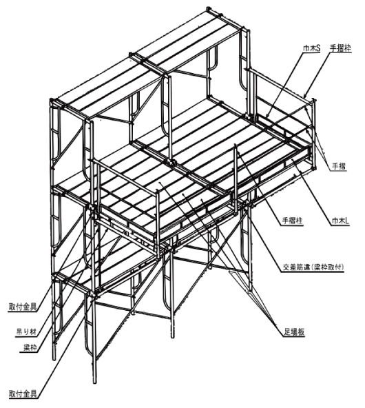 ・足場に積載する荷重は1スパンあたり3.92kN以下とし、連続して同時に積載する場合は、2スパン以下、また同一スパンに積載する場合は、2層以下とする。