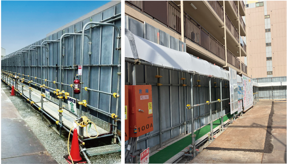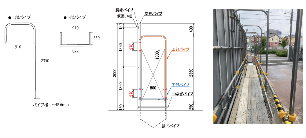 ●仮囲いの裏のスペースに、高さ1.8m以上、幅80cm以上の安全通路を効率的に確保できます。 ●風速18m/sに耐える事ができ、計算書の提出が可能です。 ●パーツを2分割にすることで扱い易さを両立しています。