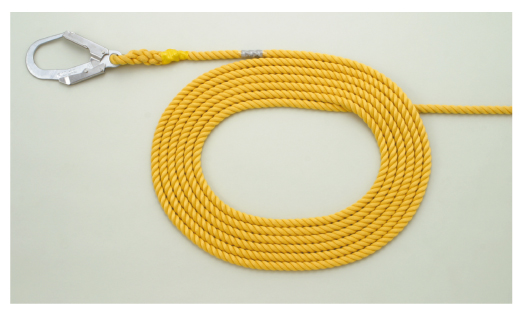 ●高所作業における墜落防止対策に使用する 高強力・低伸度の大口径フック付きロープです。