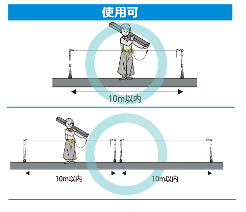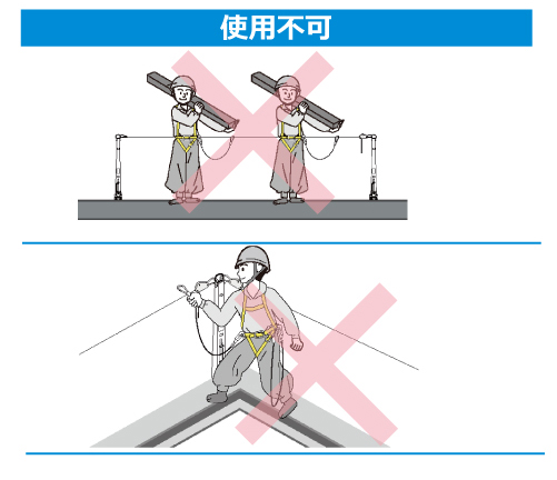次に該当する場合は使用しないでください。 ◆親綱支柱 ・落下衝撃をうけた。・著しい変形、または腐食等の破損がある。・締付ボルトに損傷、又は付着物がある。 ◆親綱 ・ストランドの山に10分の1以上の摩擦、破断がある。・薬品、汚れ、腐食、焼け焦げ等により硬化、破損がある。 ・キンクが生じた。・フックが正常に作動しない。 ◆緊張器 ・ロープストッパー部分に傷がある。・可動部の動きが悪い。・バネなどの部分が欠落、変形している。 ・フックが正常に作動しない。