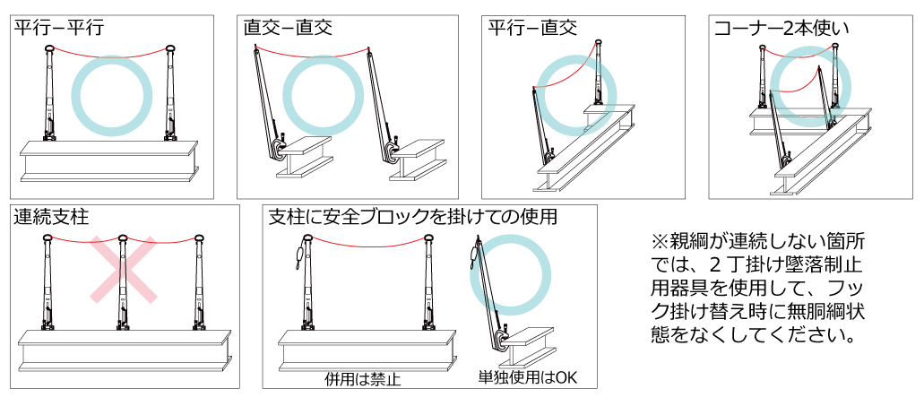 【1】適用 ●墜落災害防止のため墜落制止用器具を取り付けるための設備として使用される水平親綱支柱システムを構成 する親綱支柱・親綱・緊張器について適用する。 【2】親綱支柱の使用方法 ●支柱の奥まで鉄骨フランジに差し込み、締付ボルトを十分に締めてください(締付トルク:80N・m) ●親綱を固定する支柱のスパンは10m以下にしてください。また1スパン1人での使用としてください。 ●コーナーに使用する親綱支柱には平行方向と直交方向の2本の支柱用親綱を、同時に取付けないでください。 ●墜落制止用器具は安全性の確認されたものを用い、墜落制止用器具のランヤードの長さを1.7m以内にして 使用してください。 【3】親綱の使用方法 ●親綱支柱は鉄骨ピースや支柱の親綱保持金具へフックを取り付けて使用してください。 ●親綱として使用する場合は施工スパン10m以下で使用してください。 ●親綱は仮設工業会認定品の合成繊維ロープを使用し、ワイヤロープは使用しないでください。 【4】緊張器の使用方法 ●緊張器の使用は親綱を通し、弛みが無くなるまで引っ張ってください。 ●当社の親綱を使用してください。