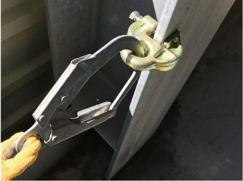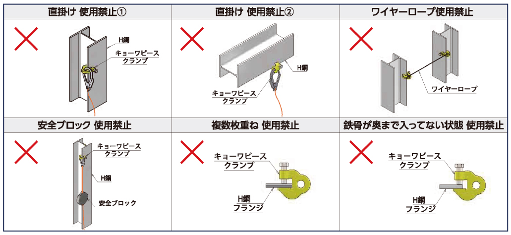 ・ピースクランプへの墜落制止用器具のフックを直掛けしないでください。 ・ワイヤロープは使用しないでください。 ・衝撃を受けたピースクランプは使用しないでください。 ・外観やボルトに変形などの異常があるものは使用しないでください。 ・ピースクランプ1個に対して、親綱ロープのフックを複数掛けして使用しないでください。 ・用途外の使用はしないでください。