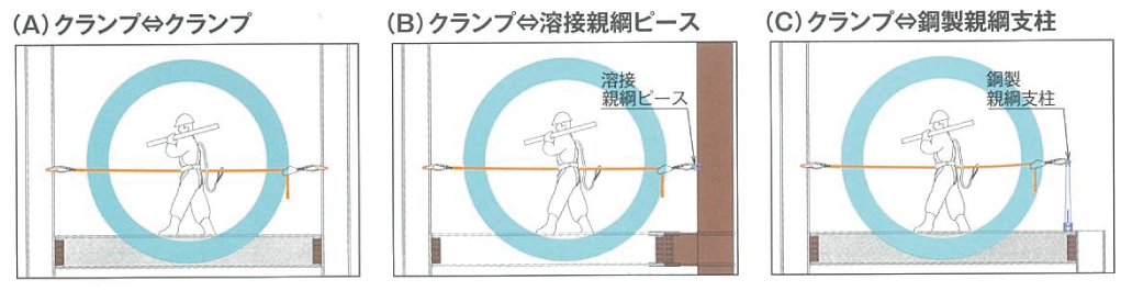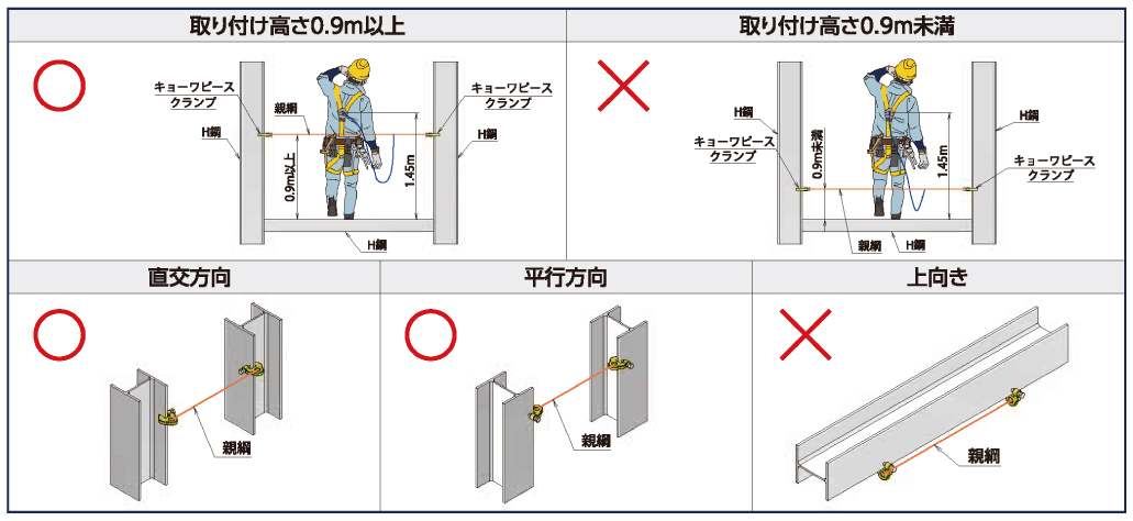 ●90N・mのトルクで締付けてください。 ●作業床より0.9m以上の場所に設置して、親綱ロープにてご使用ください。 ●ピースクランプ及び鉄骨フランジ部に付着した油、異物がある場合は除去後に使用してください。 ●使用する親綱ロープのスパンは10m以下で使用してください。 ●取付方向は以下に従い、禁止方向に取付ないでください。