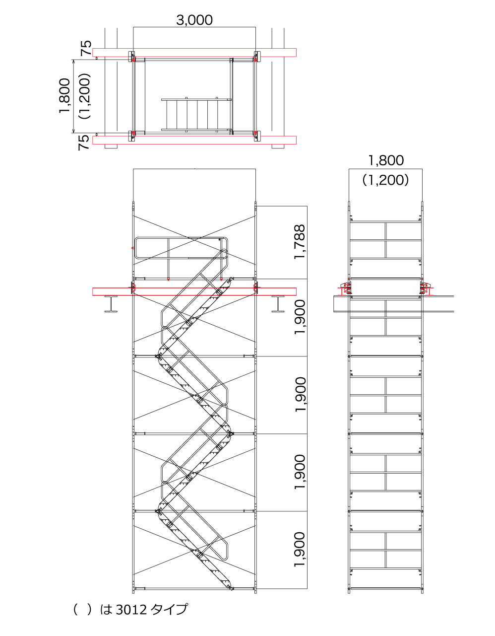●工事の状況に合わせ、1.9mピッチで段数の増減ができます。