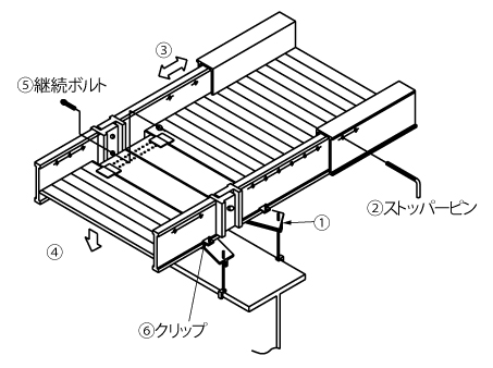 1.フライングブリッジは、支持梁上での接続を基本として設計されています。連続でご使用される場合は、接続箇所が梁上に来るように計画してください。
