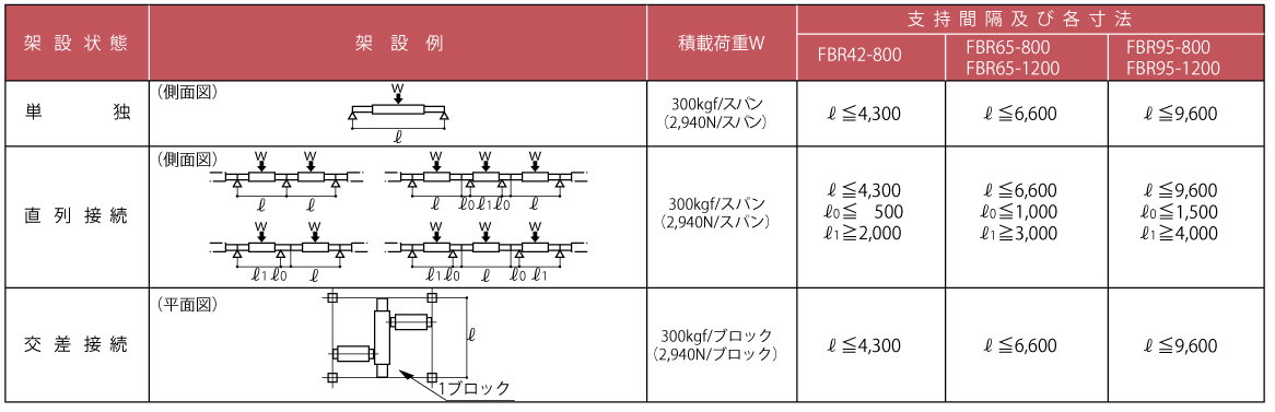 2.上表以外の架設状態でご使用される場合は、支持間隔等が変わってきますので、ご相談下さい。
