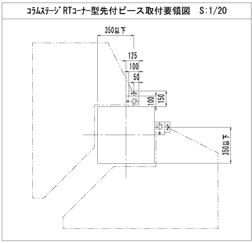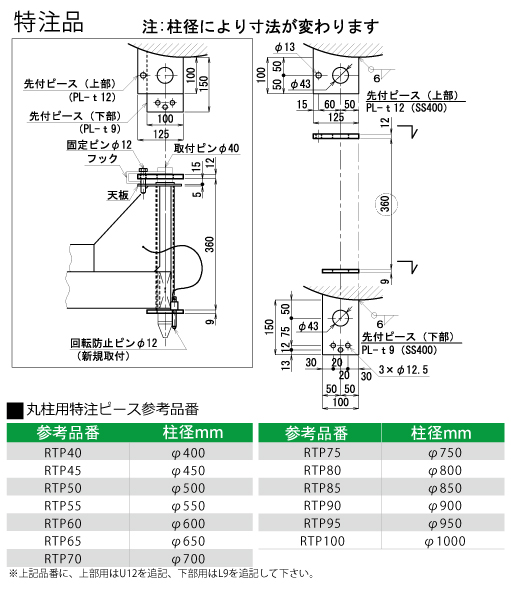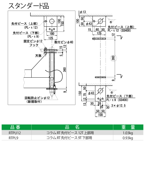 1. 溶接脚長:6mmの隅肉溶接 2. 先付けピースの取付位置は下の先付けピース上面がスラブ(デッキPL)など天端より100mm以上離し、上下ピース間は360mmとします。