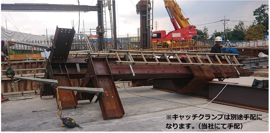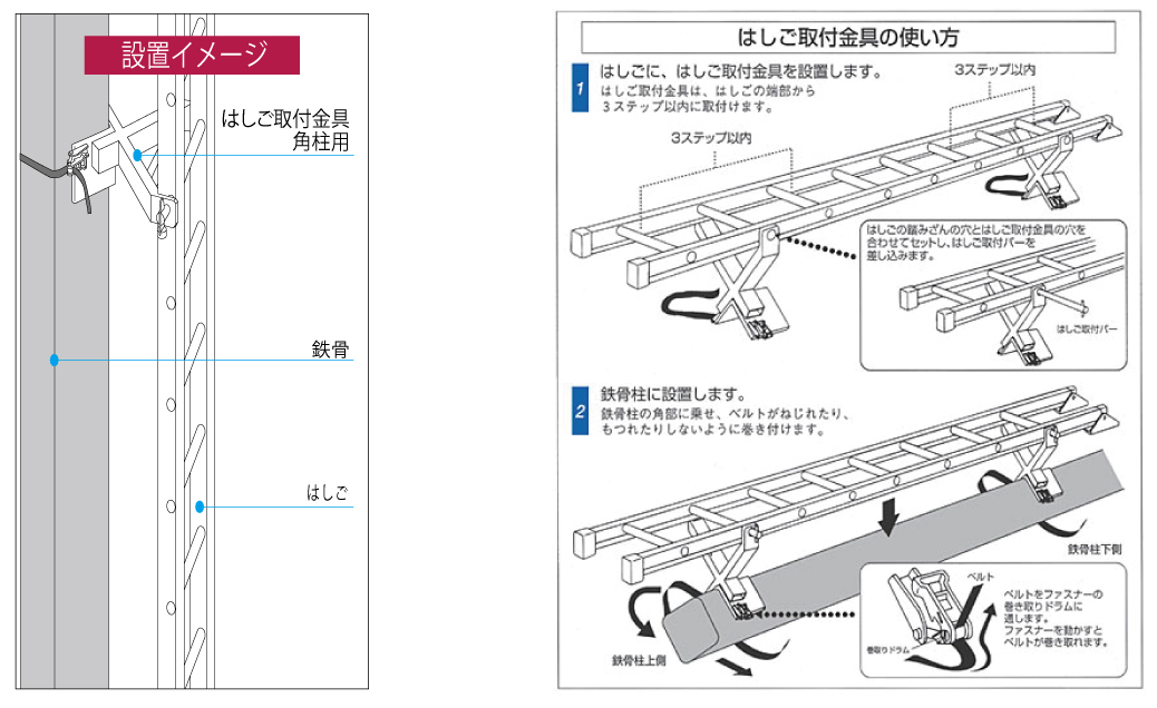 ●梯子の両端から3ステップ以内の上下に取り付けて、鉄骨柱にベルトで締付け固定する。 ●鉄骨柱がコラム以外の時は各角でベルトが切れないように養生してください。