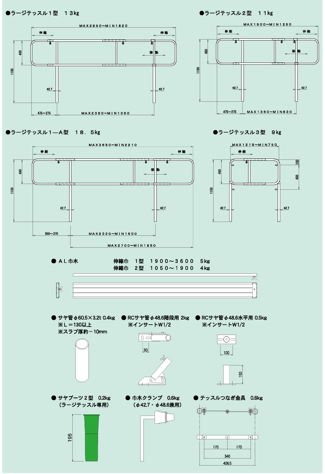 ●開口部分墜落・転落防止として、軽量かつ伸縮構造なことから取り付け、取り外しが簡単にできます。 ●サヤ管に生コンが入るのを防ぐ専用のブーツにより、生コンの侵入を防ぎ 本体を外さなくても打設できます。 ●手摺・足がスライド式の為、サヤ管のピッチが多少ずれても支障なく取り付けができます。