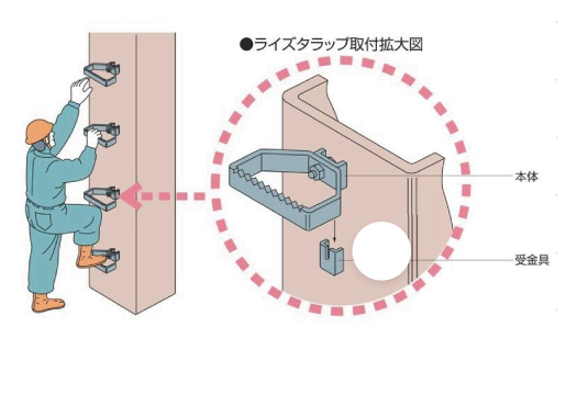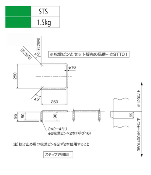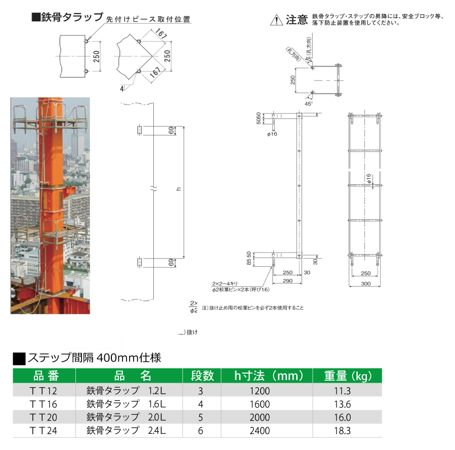 ●受金具が一つのため、小径角形柱にも、丸柱にも取付可能 ●受金具が一つのため工場内の作業性が良い。 ●ボルト、ナットで締付けるのでガタツキがなく安全。 ●脱着が簡単。 ●受金具を20mm以下にしているのでALC板の取付時に邪魔にならない。 ●Ⅱ型は踏面をノコ状に加工してあり、横すべりを防ぎ、安全。 ●本体は繰り返し使用でき、経済的。(溶融亜鉛メッキ仕上げのためサビにくい)