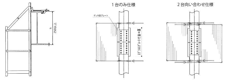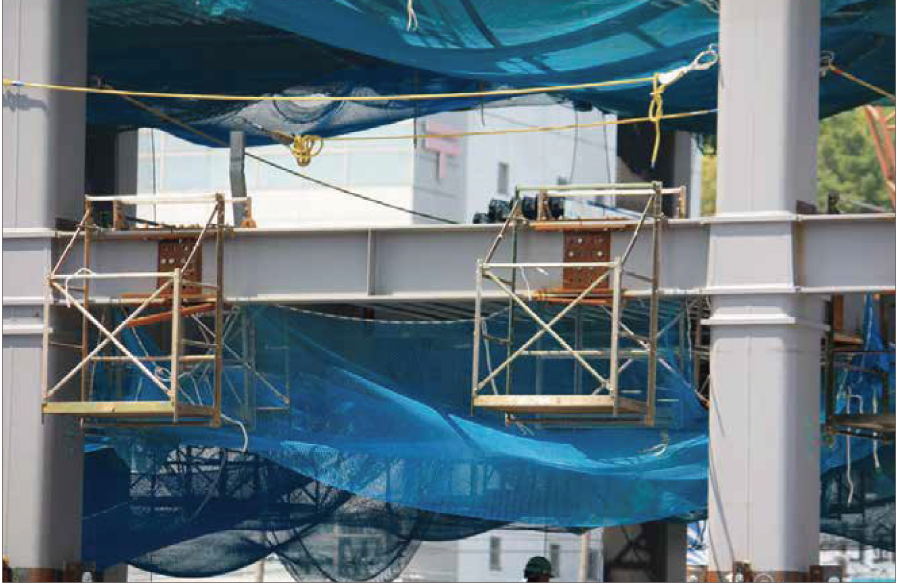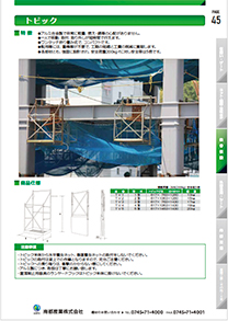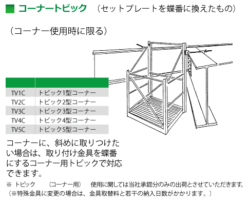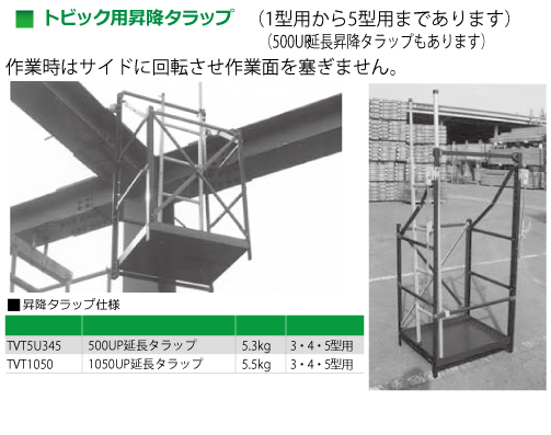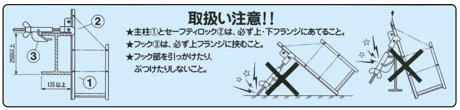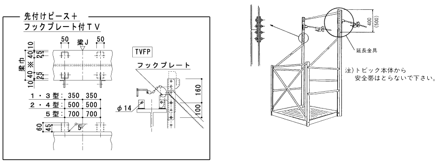 トビック本体から水平養生ネット、垂直養生ネットの取付をしないでください。 ・トビックの取付は梁上での作業となりますので、充分ご注意ください。 ・トビックへの乗り降りは、衝撃のかからない様にしてください。 ・アルミ製につき、取扱は丁寧にお願い致します。 ・墜落制止用器具のランヤードフックはトビック本体に掛けないでください。