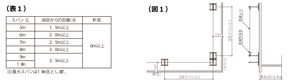 1)支柱の取付スパン(L)と軒先及びケラバの各々の端部から距離(A)を(表1)に示します。